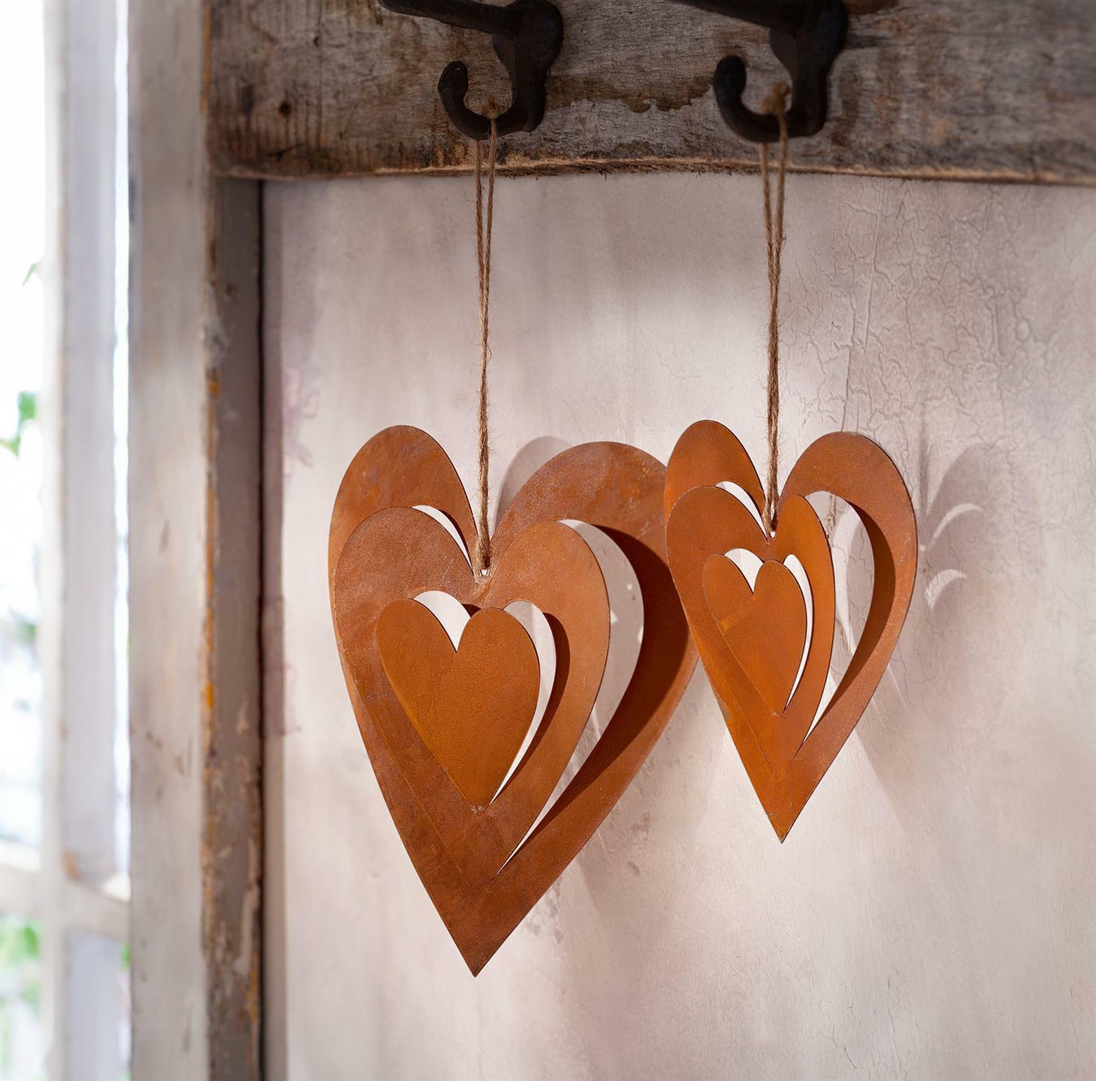 Závěsná kovová dekorace Srdce se skládá ze 2 kusů. Rezavý design.
